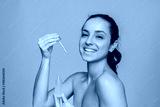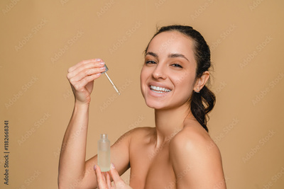 Photo of smiling woman girl with clean perfect skin applying hyaluronic serum on her face with pipette, holds a moisturizing product acid fluid isolated on beige background. Skin care beauty concept.
