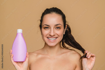 Portrait of attractive cheerful woman girl with long healthy shiny brown hair holding in hands keratin shampoo haircare treatment product isolated on beige pastel color background