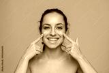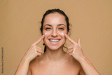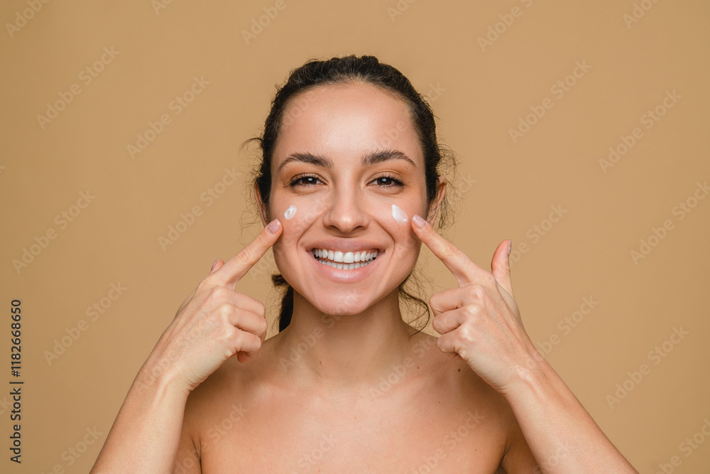 Photo of a beautiful smiling woman with perfect clean skin applying moisturizer cream cosmetic product on her face cheeks posing isolated on beige background. Beauty skincare concept