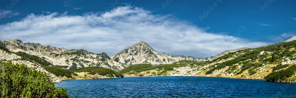 Panoramic view of the mountain lake in windy summer day. Banderishko Dalgoto lake with grassy banks and Muratov peak on the horizon. Pirin national park, Bulgaria.