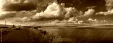 countryside near lake with asphalt road, pond, countryside hills, arable fields, under bright blue sky, travel