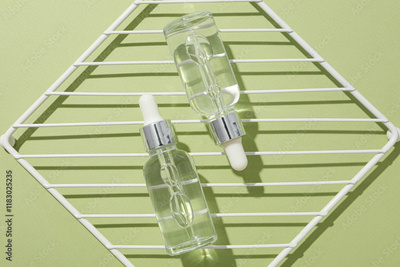 Transparent cosmetic bottles on a green background