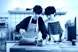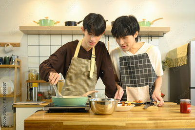 Happy young gay couple in aprons cooking together in their cozy kitchen