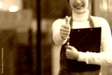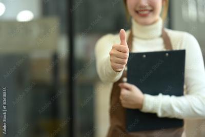Cheerful coffee shop owner in an apron giving a thumbs up while holding a clipboard
