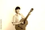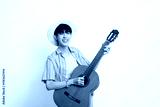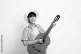 Smiling young man wearing casual striped shirt playing an acoustic guitar over white background