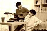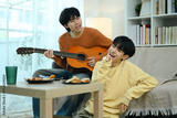 Cheerful gay couple enjoying casual moment at home playing the guitar and singing in living room