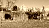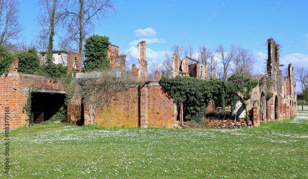 Old brick farmhouse abandoned in the countryside