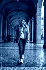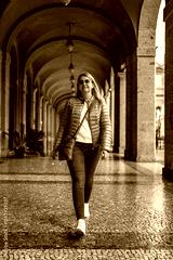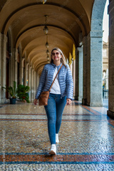 Happy mature woman walking under arcades of beautiful old building in european city on autumn day. Front view