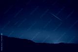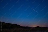 Countryside silhouettes under the stars, Milky Way and meteor shower.
