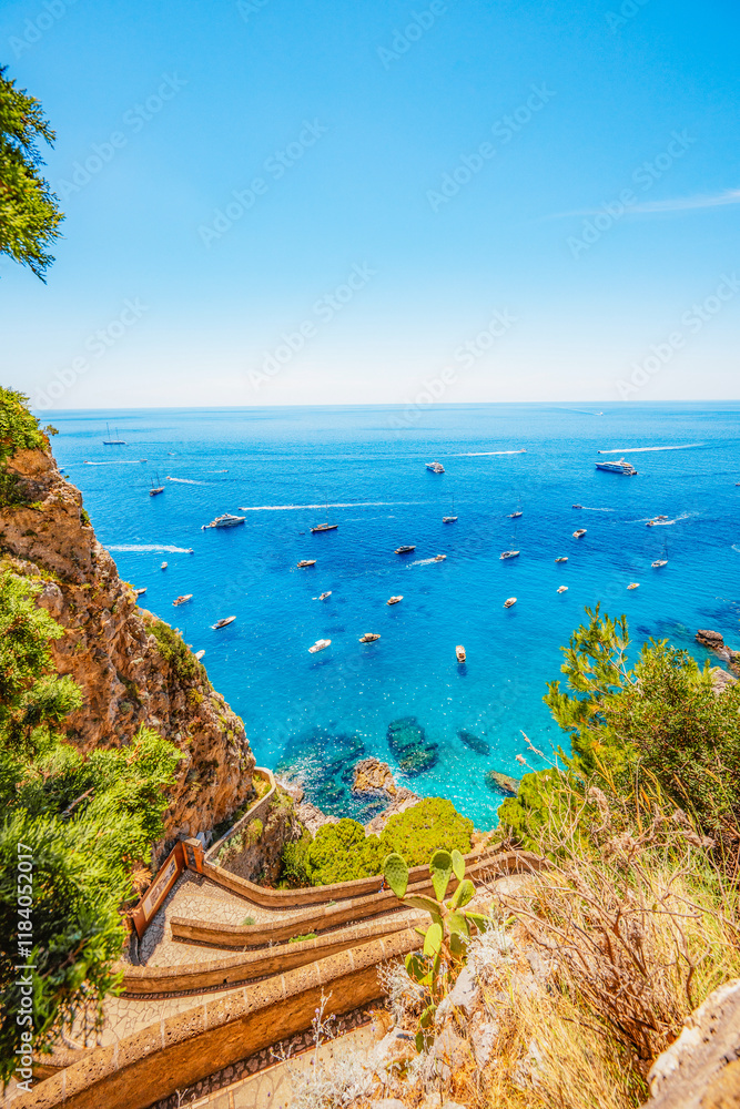 Via Krupp on Capri island in Italy. Faraglioni Rocks, Marina Piccola and Monte Solaro on Capri Island, Italy