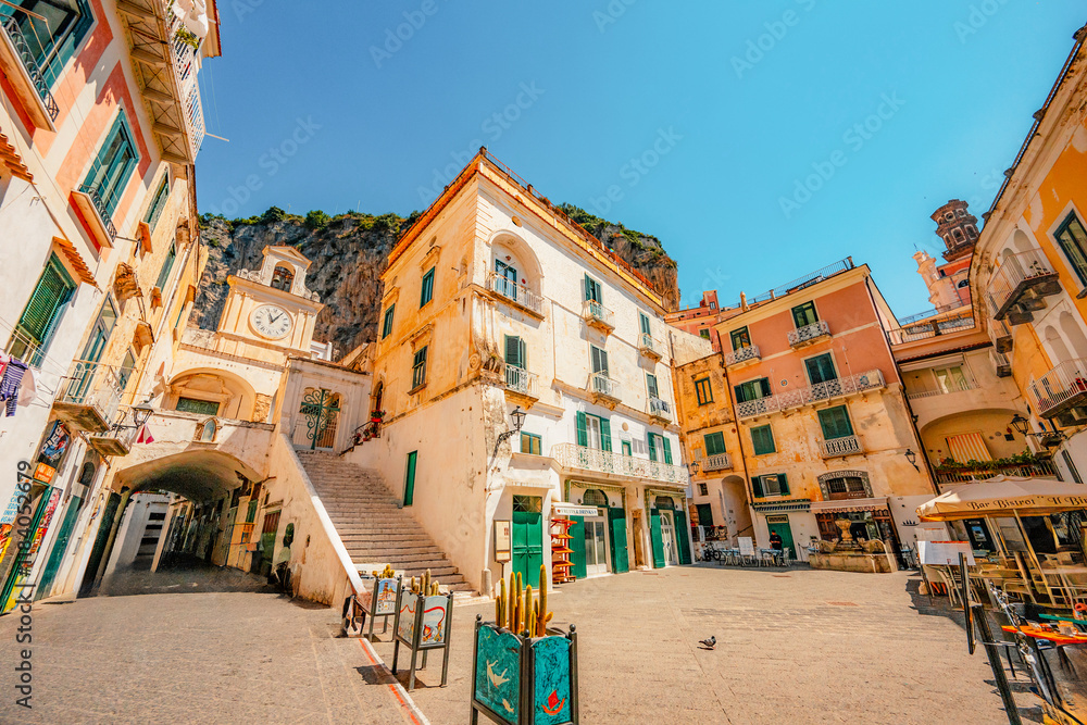 Atrani famous coastline in southern Italy, vertiginous cliffs adorned with colorful villages, turquoise waters. Small town Atrani on Amalfi Coast in province of Salerno, Campania region, Italy