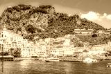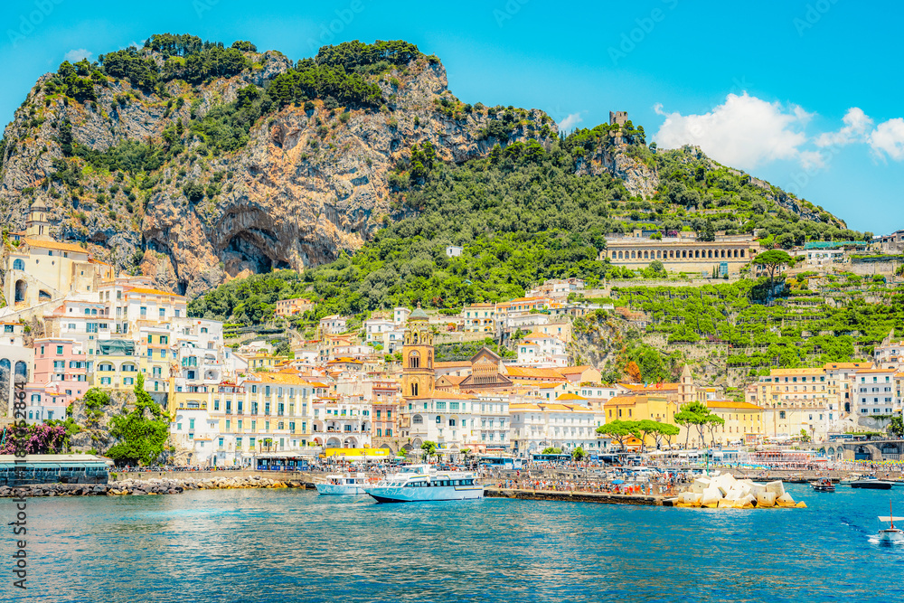 Amalfi coastline in southern Italy, vertiginous cliffs adorned with colorful villages, turquoise waters. Town Amalfi on Amalfi Coast in province of Salerno, Campania region, Italy