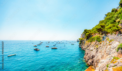 Positano coastline in south of Italy, vertiginous cliffs adorned with colorful villages, turquoise waters. Small town Positano on Amalfi Coast near Neapol, Italy