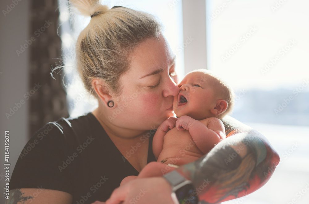 Happy lesbian woman with their little newbaby at home