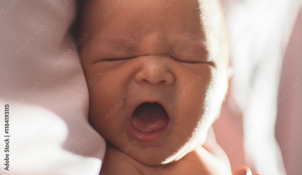 Adorable baby in pink sunny bedroom. Newborn child crying in bed.