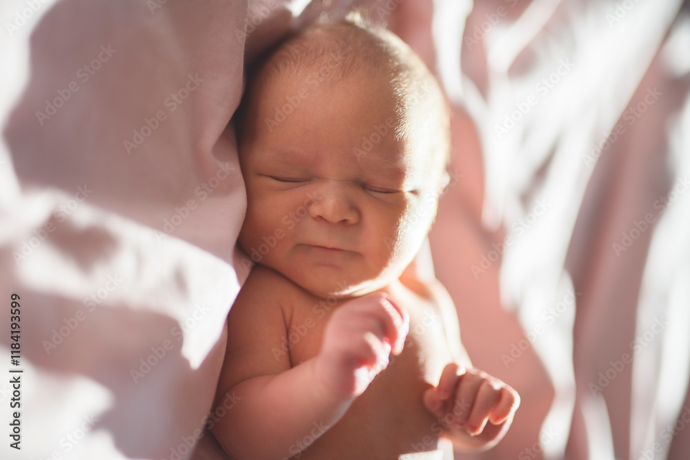 Adorable baby in pink sunny bedroom. Newborn child relaxing in bed.