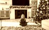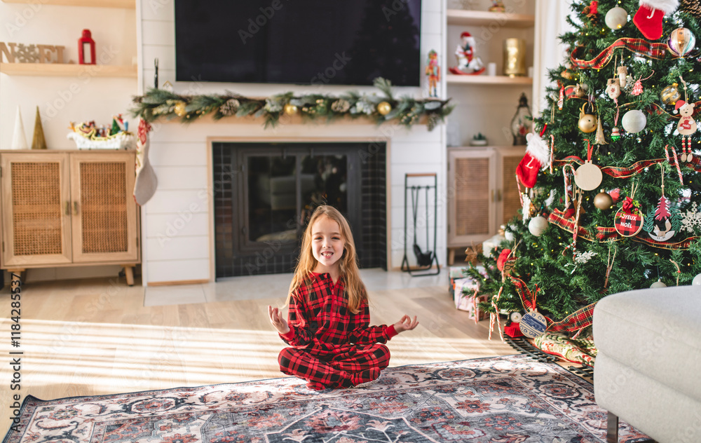 Happy little kid in pajamas in living room with traditional fire place.