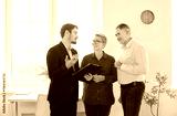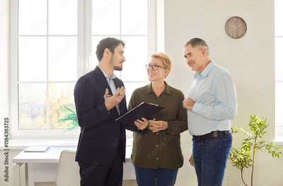 Elderly couple explores a property or apartment with a real estate agent or realtor, considering purchase or rental options. The consultation focuses on housing needs and preferences.