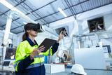 Modern Factory Innovation Technology in Industry, Technician using VR Virtual Reality Headset