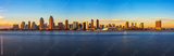 Panoramic view of San Diego's skyline at sunset, captured from Coronado Island with a long exposure, highlighting calm waters and city lights.