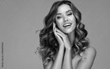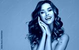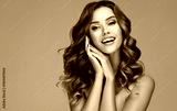 Beautiful white-toothed smiling woman with long and shiny wavy hair . Beauty happy model girl with curly hairstyle . Gorgeous white teeth in a smile