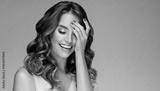 Beautiful white-toothed smiling woman with long and shiny wavy hair . Beauty happy model girl with curly hairstyle . Gorgeous white teeth in a smile