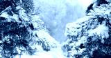 snowy pine tree branches close up, winter nature background. Beautiful Winter landscape, frosty cold weather. Christmas, new year holidays.