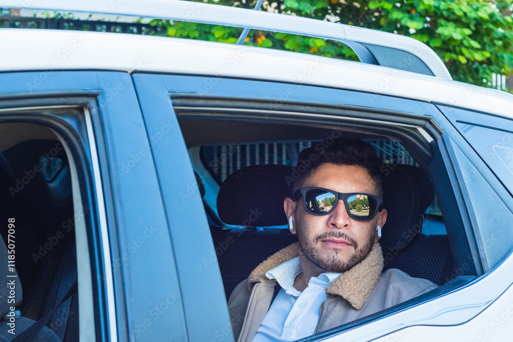 A guy sitting in the back of a car, passenger of a white vehicle. The man is wearing black glasses and a jacket.