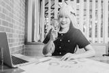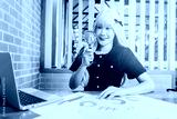 Young Woman with Long White Hair Holding Magnifying Glass in Cafe Setting