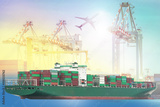 Logistics and transportation Container Cargo ship and Cargo plane with working crane bridge in shipyard background, logistic import export background and transport industry.