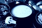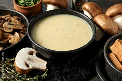 A bowl of mushroom cream soup on a dark background
