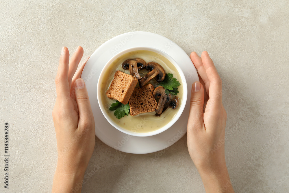 A bowl of cream of mushroom soup with croutons