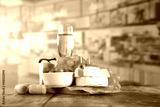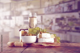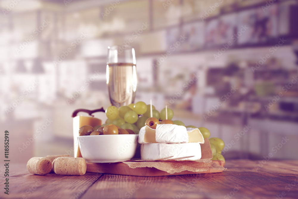 Grapes, cheese and wine on wooden kitchen table with interior background.