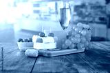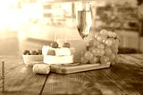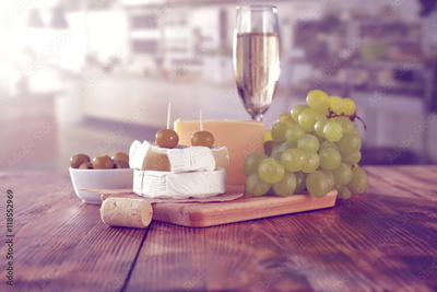 Grapes, cheese and wine on wooden kitchen table with interior background.