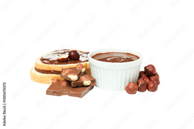 PNG,Chocolate paste in a bowl with bread, isolated on white background