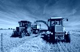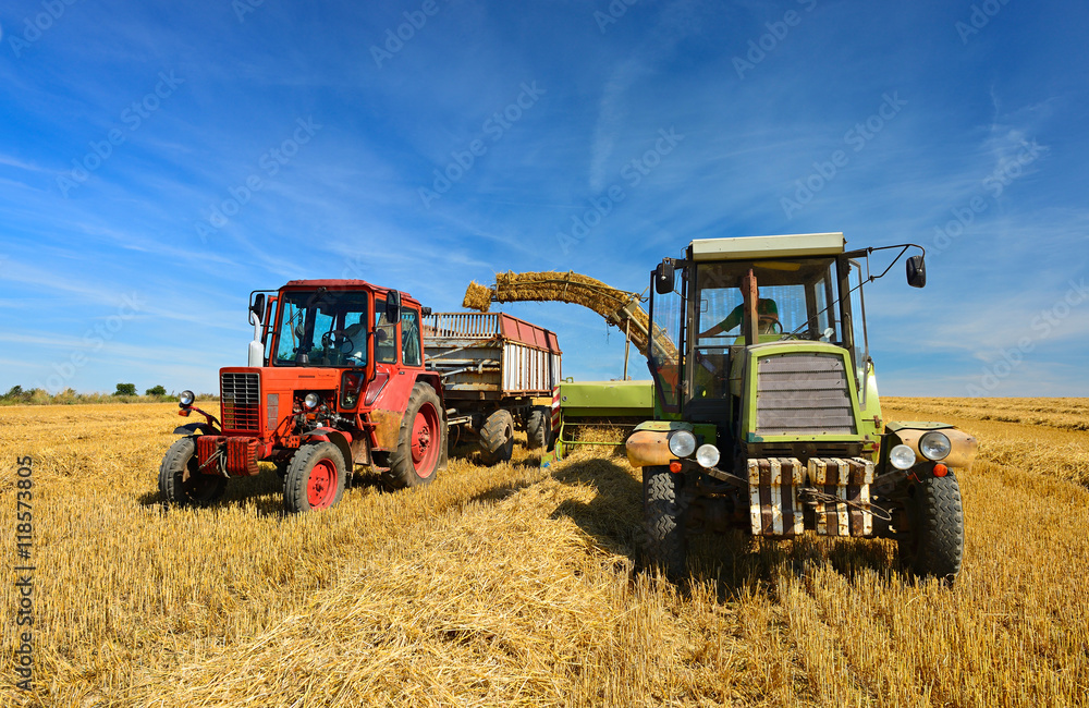 Farmers harvesting Straw, Baler unloads Bales onto Tractor Trailer, Summer Field Landscape under blue sky
