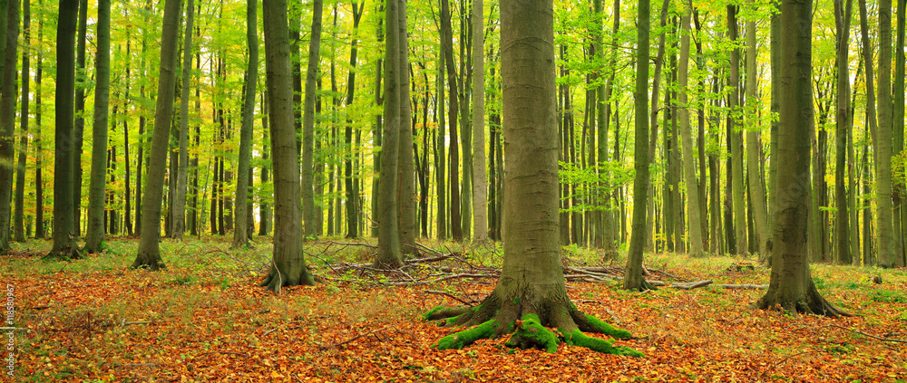 Beech Tree Forest in Early Autumn, Moss Covered Roots