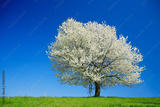 Big Cherry Tree in Full Bloom on Meadow under Blue Sky