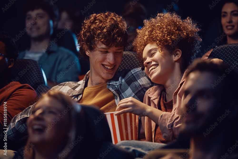 Young happy couple eating popcorn and having fun at movie theatre.