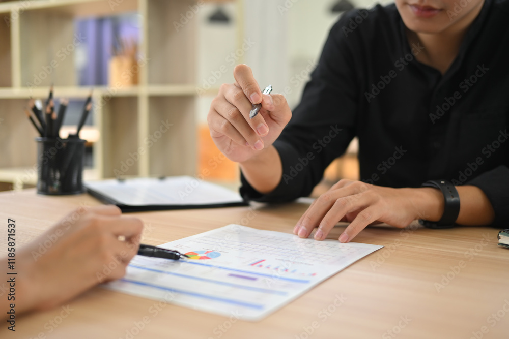 Close up of two professional businesspeople discussing a report with graphs and charts in modern office