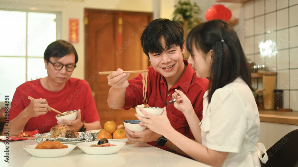 Cheerful couple sharing food at a beautifully decorated Chinese New Year table.