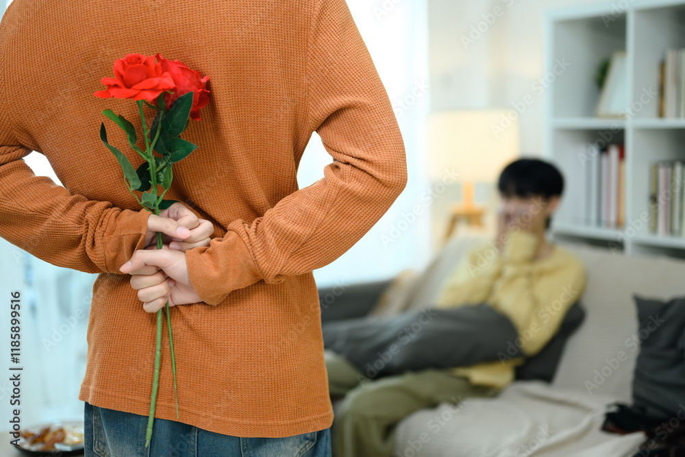 Rear view of man hiding red rose while walking towards his boyfriend preparing to surprise