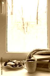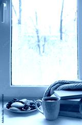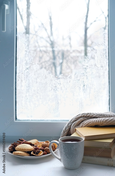 tea mug, cookies, nuts, books and sweater against frosty window. home comfort in snowy cold weather. relax and reading in winter season. cozy atmosphere. Christmas, New Year holidays background.