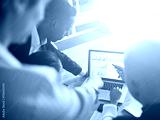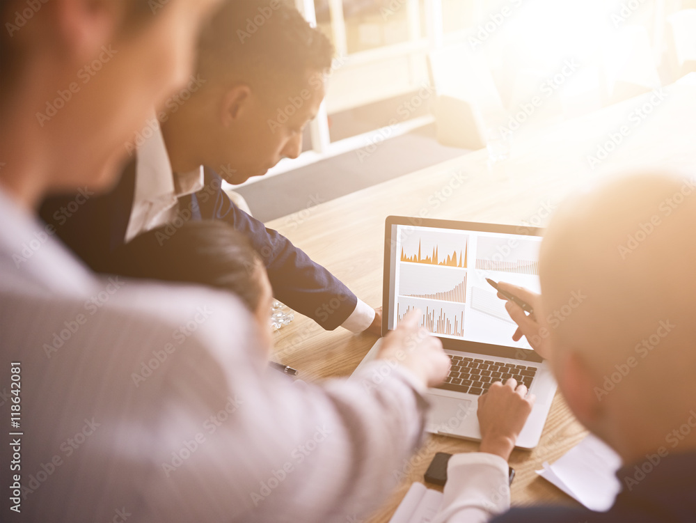 Group of four people pointing to and analysing graphs and charts all displayed on a notebook in front of them to determine performance goals for the next year as a group.