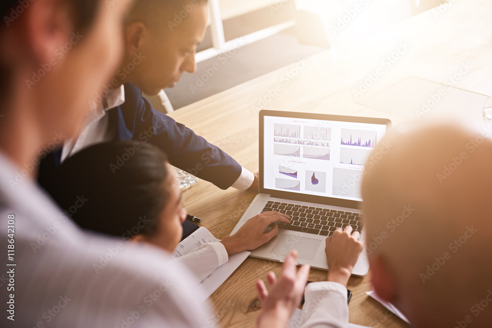Group of four people pointing to and analysing graphs and charts all displayed on a notebook in front of them to determine performance goals for the next year as a group.
