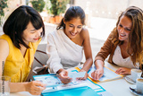 University exchange students organizing a trip abroad at a cafe