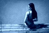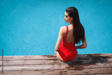 woman in red swimsuit sitting near the pool, summer tan