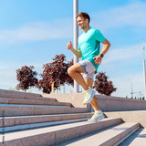 Man exercises by running down outdoor stairs on a sunny day in an urban park setting