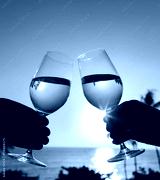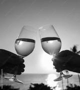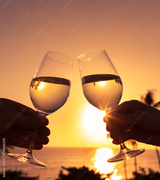 Couple holding pair of wine glasses.