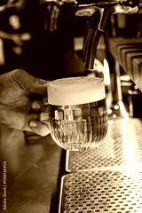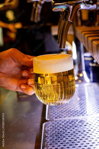 Hand of bartender pouring a large lager beer in tap